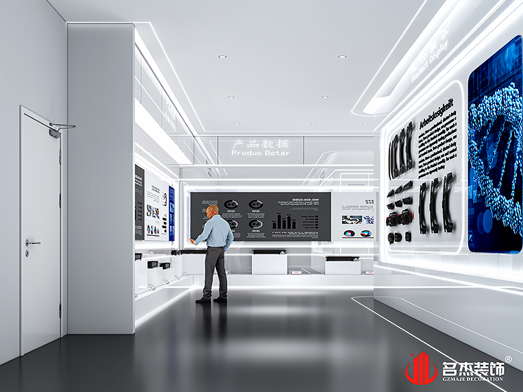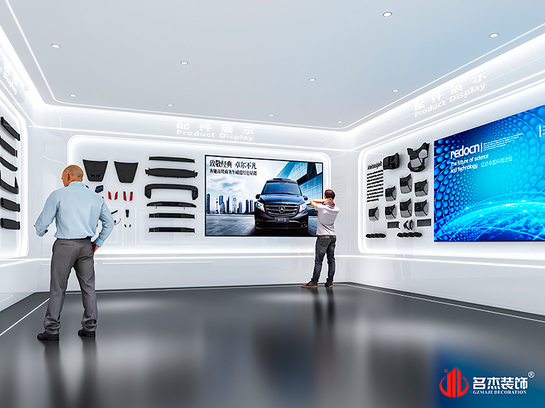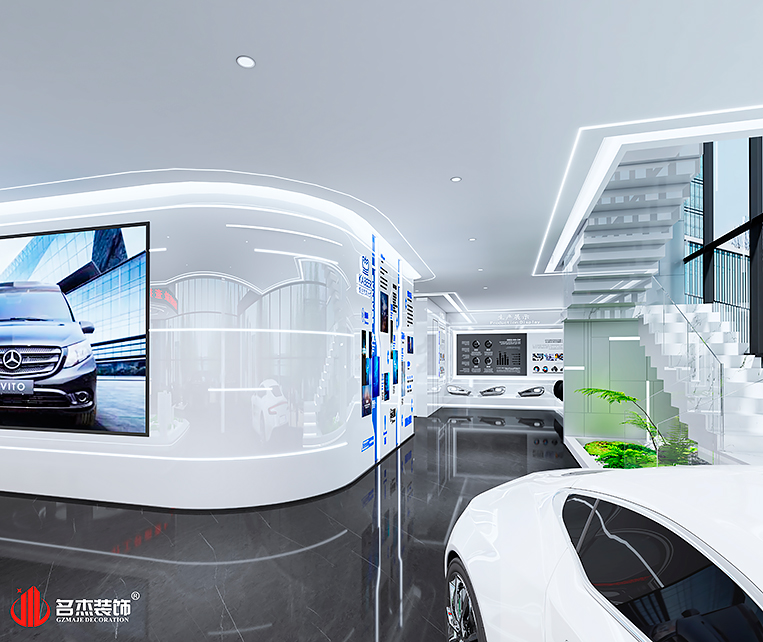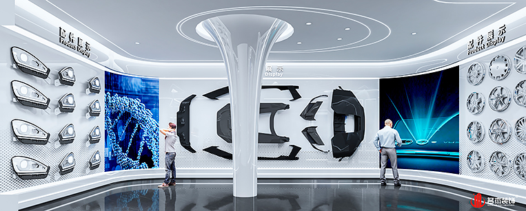 該項目是一家專門從事新能源汽車電附件銷售、汽車零部件研發、汽車裝飾用品銷售、汽車零部件及配件制造的企業,屬于新能源汽車制造行業,因此需要將科技元素以及汽車元素融入到整體展廳設計當中,這非常考驗設計團隊的設計功底。而設計團隊采用科技風格搭配時尚簡約風格,創造出一個特別的汽車工廠展廳裝修設計空間。