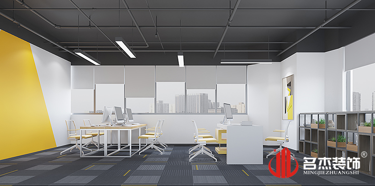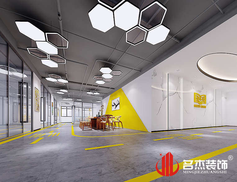 整個辦公室裝修設計空間采用的是時尚簡約的風格,大面積的黃色色塊的加入,讓空間中不再單調(diào)的同時也增加了幾分時尚感。前臺使用大理石條紋的背景墻,加以圓形的吊頂造型,搭配出不一樣的時尚感。