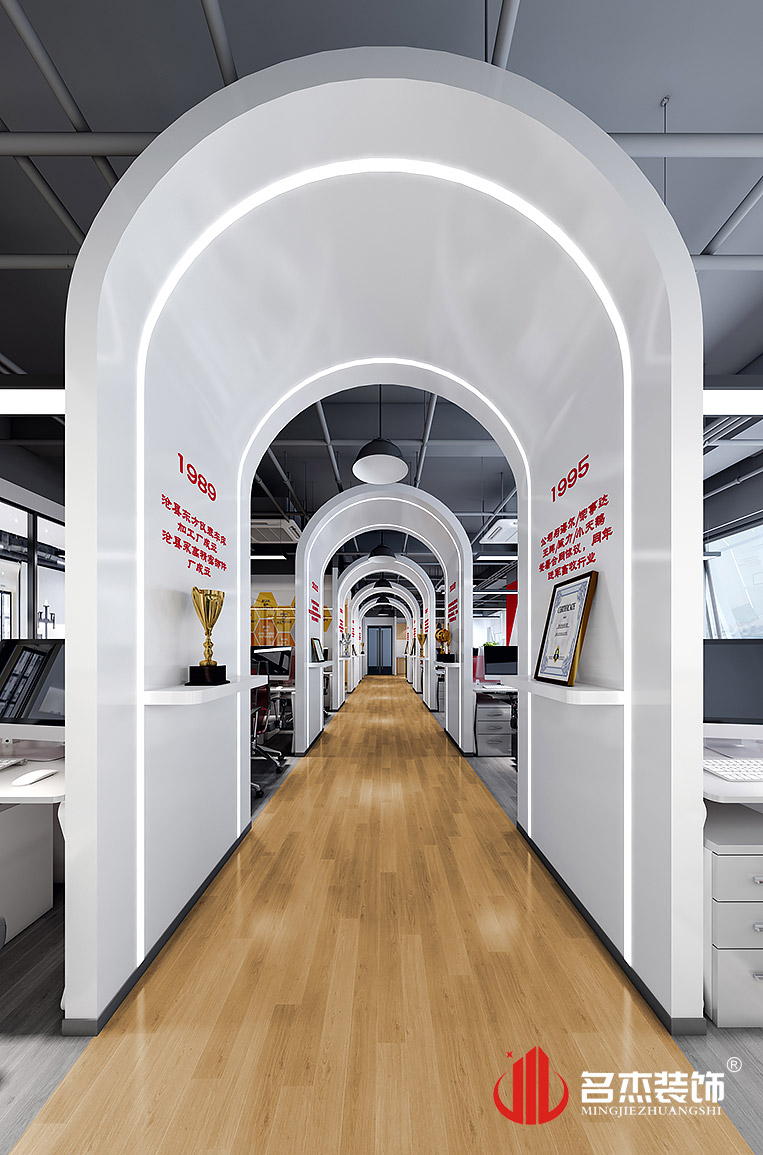 在前臺(tái)裝修設(shè)計(jì)的時(shí)候,燈帶的加入讓空間中充滿了不一樣的設(shè)計(jì)感,而且在辦公區(qū)域的過道旁邊,加入了時(shí)光隧道的設(shè)計(jì)元素,讓整個(gè)企業(yè)的發(fā)展歷程都能隨時(shí)讓人看見,企業(yè)文化也不知不覺中融入到整體的環(huán)境中。