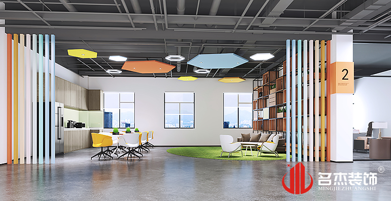 在整體的辦公室裝修設計當中,加入了多種色彩組合成的茶水間,作為整個空間中亮點,讓辦公室裝修設計空間變得不再單調。這次客戶提出了加入黨員會議室的要求,設計團隊根據客戶的需求來進行設計。展廳部分則是加入了形狀特別的吊頂造型,讓整體辦公室裝修設計空間看起來簡約而不簡單。