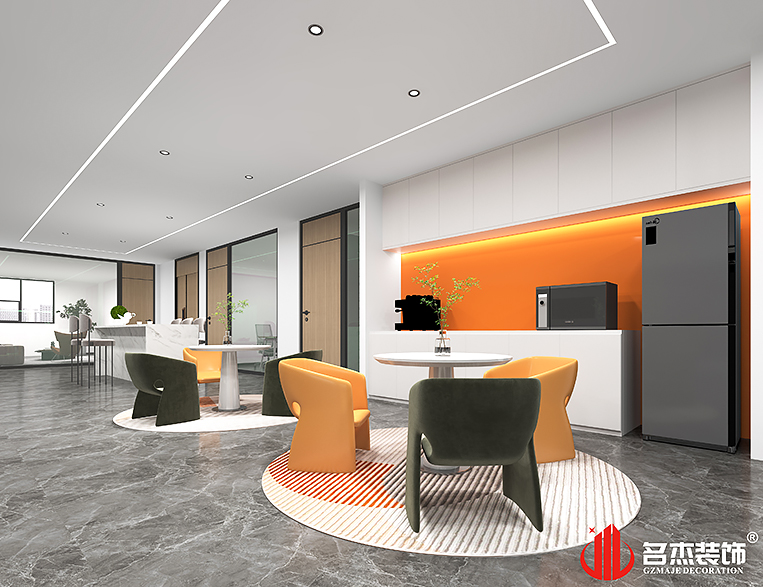 整體辦公空間裝修設(shè)計(jì)當(dāng)中使用橙色作為空間的點(diǎn)綴色,讓空間能夠抓人眼球的元素,同時(shí)還可以提高辦公室裝修設(shè)計(jì)空間的層次感。休閑區(qū)也使用了較為傳統(tǒng)的元素進(jìn)行裝修設(shè)計(jì),加入亮眼的橙色作為點(diǎn)綴色,可以讓員工得到放松。