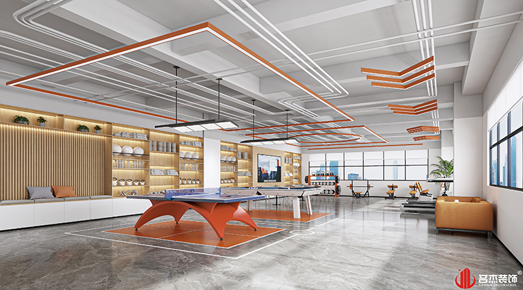 這次的主打風格是時尚簡約風格,前臺背景墻區域采用漸變的方式,以及在天花上面使用不銹鋼水波紋蜂窩板來為這個空間增添不少設計感。而在健身區使用橙色作為空間的點綴色,暖黃色作為背景墻,和橙色形成一種呼應。#廣州辦公室裝修設計#