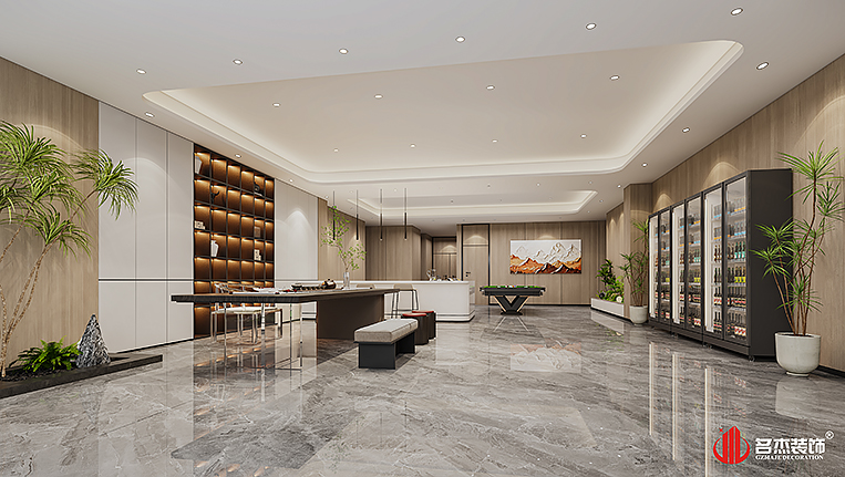 空間中的前臺接待區(qū)域使用造景的設(shè)計(jì)手法,來突出風(fēng)生水起的設(shè)計(jì)重點(diǎn),配合前臺背景墻使用的碳晶板,以及燈條作為點(diǎn)綴設(shè)計(jì)元素,搭配出不一樣的裝修設(shè)計(jì)效果。對于棋牌休閑空間來說,燈光是非常重要的元素之一,因此設(shè)計(jì)團(tuán)隊(duì)也著重在這方面上的設(shè)計(jì),通過使用造型不同的燈具,為空間增加了不少的時(shí)尚潮流感。#廣州公裝裝修公司#